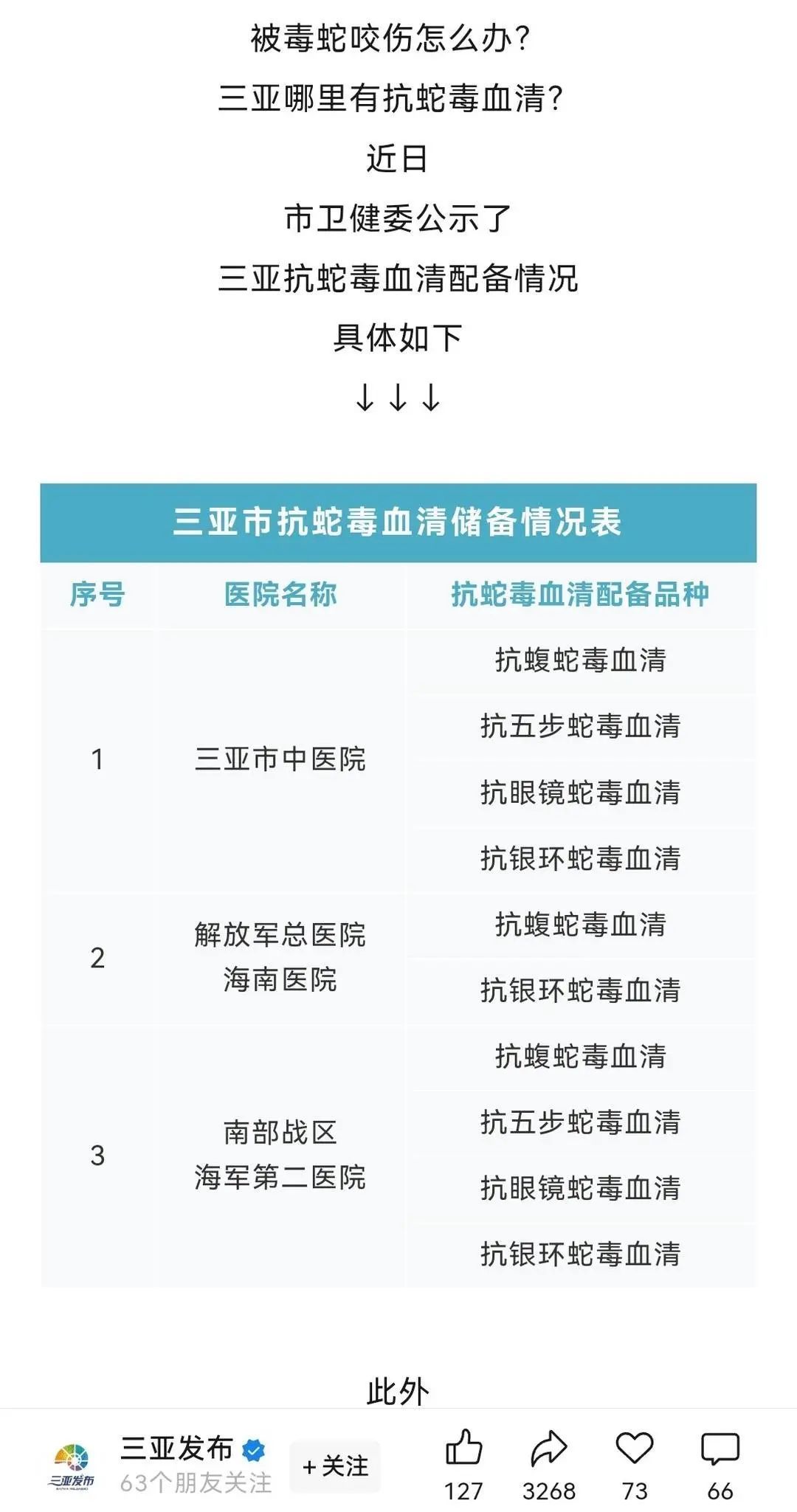 三亚公布的抗蛇毒血清病院信息(三亚发布官方账号截图)